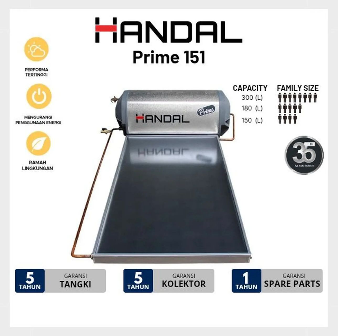 Handal 151 PRIME hadir sebagai sistem pemanas air tenaga surya berkapasitas 150 liter yang direkayasa secara khusus untuk menyajikan performa puncak, durabilitas ekstra, dan efisiensi energi tingkat tinggi. Didukung oleh satu unit panel kolektor premium, sistem ini menjamin stabilitas suplai air panas harian yang melimpah, dirancang sempurna untuk memenuhi standar kenyamanan tingkat tinggi bagi keluarga modern.